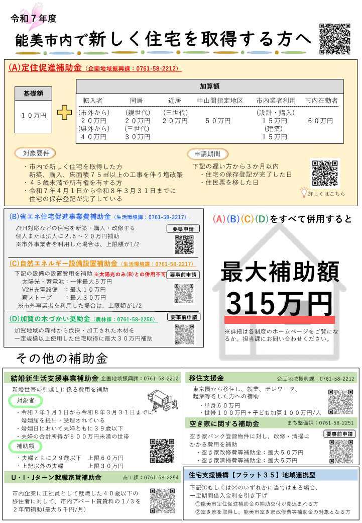 結婚新生活支援事業補助金 / 定住促進補助金 / 住宅金融支援機構「フラット35」 / 空き家改修費等補助金 / 空き家清掃費等補助金 / 加賀の木づかい奨励金 / 自然エネルギー設備設置補助金 / 在宅支援型住宅リフォーム助成金 / 耐震改修補助金 / U・I・Jターン就職家賃補助金 / 移住者支援レンタカー補助金 / 移住支援金 / 能美市マイカー購入応援企業補助金
