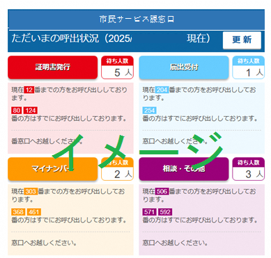 令和7年10月1日から市民サービス課(本庁舎)窓口のリアルタイムの混雑状況がインターネットから確認できます。混雑している日や時間帯を避けたり、窓口での待ち時間の有効活用にお役立てください。
