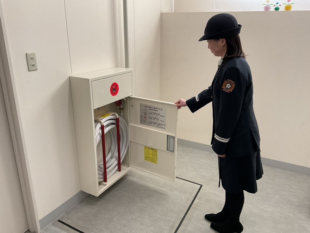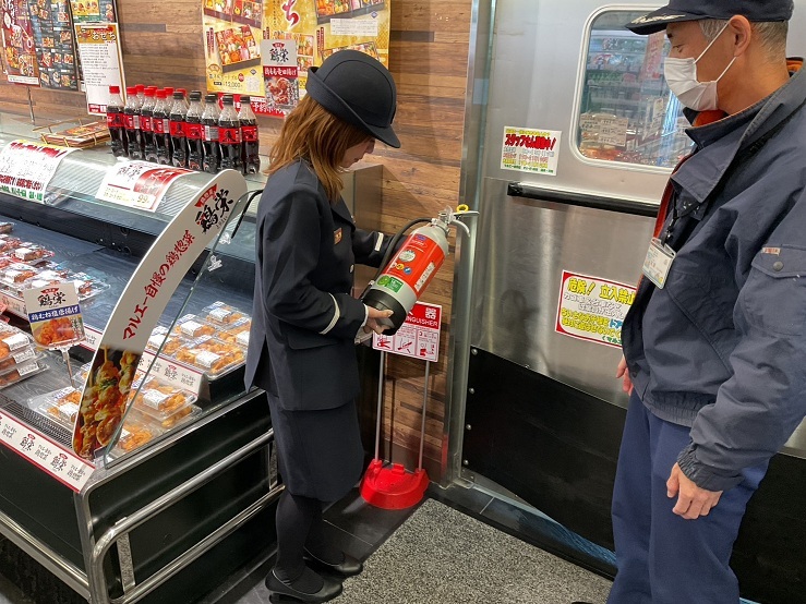 年末年始は商品の陳列や利用客が増えることから、避難通路の障害や消防用設備の操作障害が発生しやすくなります。能美市消防団女性分団員4名と能美市消防本部寺井消防署員4名にて査察を実施し、避難通路の状況、防火設備の作動障害、消火器・非常警報設備などの操作障害がないか確認しました。